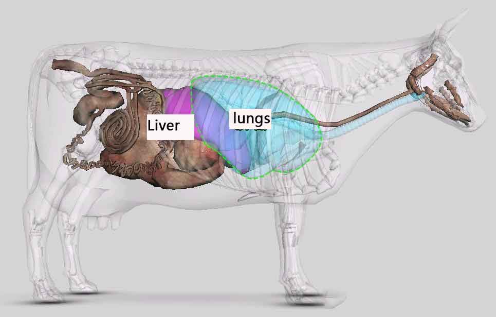 To assess the cow’s liver, the ultrasound probe is placed at a specific location: